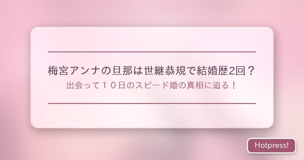 梅宮アンナさんが2025年5月に再婚したことが話題になっていますね。 お相手はアートディレクターの世継恭規さんで、なんと出会ってわずか10日でのスピード婚だったそうです。 「えっ、10日で結婚!?」と驚いた方も多いのではないでしょうか。 実は梅宮アン...