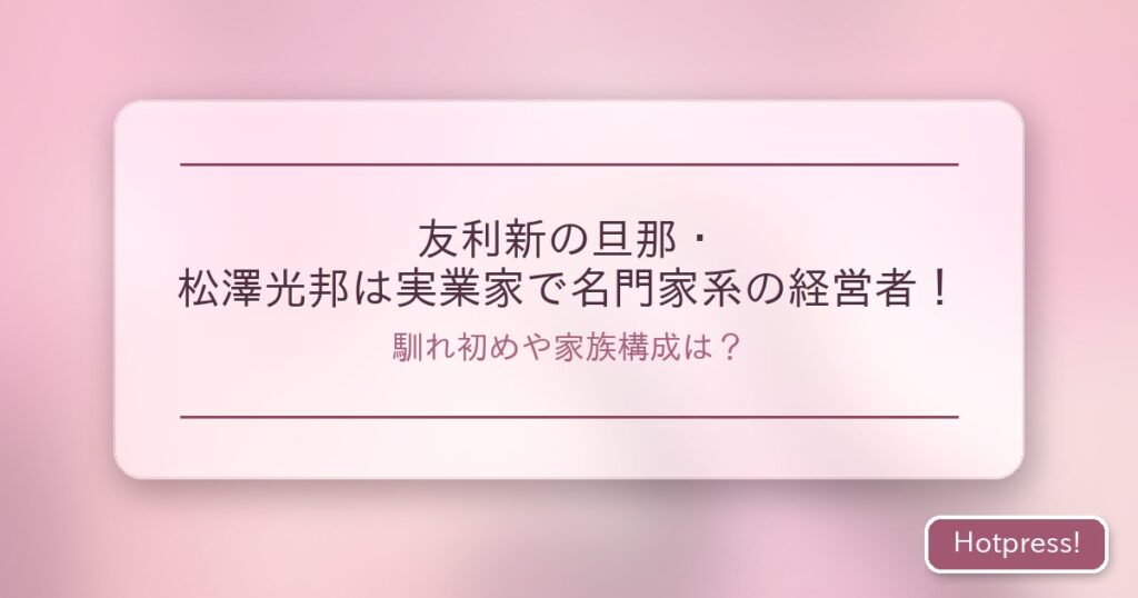 美容皮膚科医として活躍し、テレビやSNSでも人気の友利新さん。 その美しさと知性、そして温かい人柄で多くの人々を魅了している友利新さんですが、実は素敵な旦那さんがいることをご存知でしょうか? 友利新さんの旦那さんである松澤光邦さんは、名門家系... -