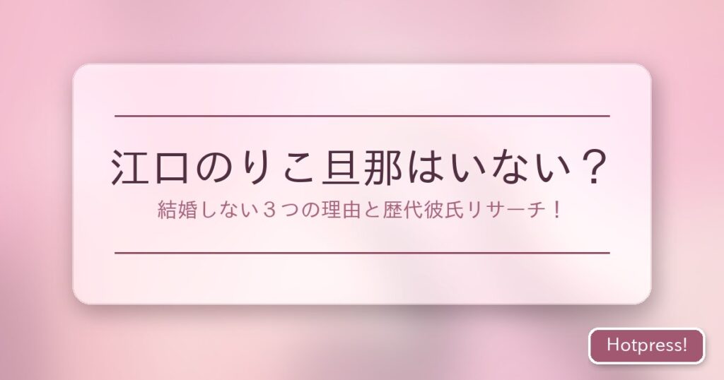 江口のりこさんの旦那や結婚について気になっている方も多いのではないでしょうか?実は、江口のりこさんには現在旦那はおらず、独身を貫いています。なぜ結婚しないのか、その理由や過去の恋愛遍歴について詳しく調べてみました。 この記事では、江口のり... -