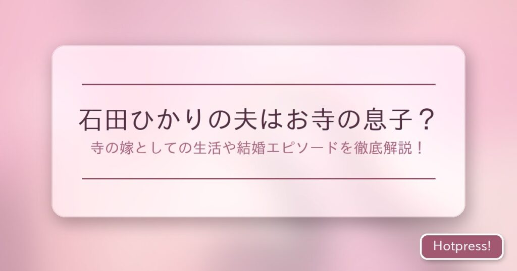 女優として活躍する石田ひかりさんの夫が、実はお寺の息子だということをご存知でしょうか? 石田ひかりさんと夫・訓覇圭さんの結婚生活や、「寺の嫁」としての意外な一面が話題を呼んでいます。 今回は、石田ひかりさんの夫のプロフィールや経歴、お寺と... -