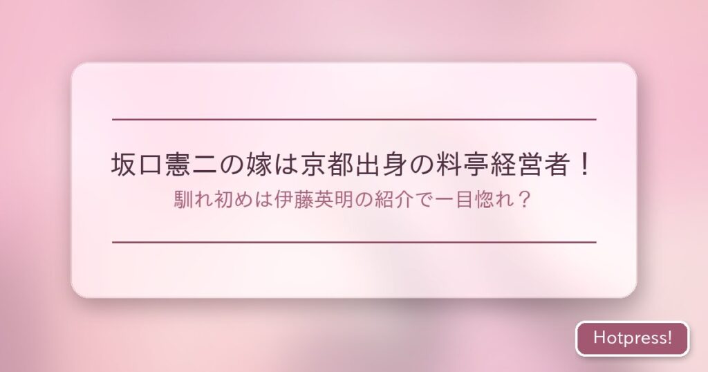 俳優として数々の作品で活躍し、多くのファンを魅了してきた坂口憲二さん。そんな彼の結婚生活に、最近再び注目が集まっています。 京都出身の料亭経営者である奥様との馴れ初めや、親友・伊藤英明さんが果たした役割など、気になる情報が満載です。今回は... -