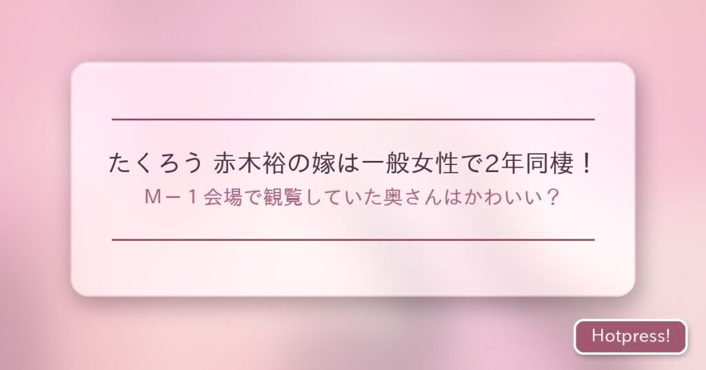お笑いコンビ「たくろう」の赤木裕さんが結婚を公表し、話題になっています。 日本テレビ系「行列のできる法律相談所」の2時間スペシャルで結婚を明かした赤木さん。 奥さんはどんな人なのか、馴れ初めや年齢など気になる情報をまとめました。 この記事で... -